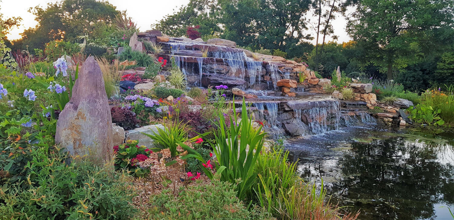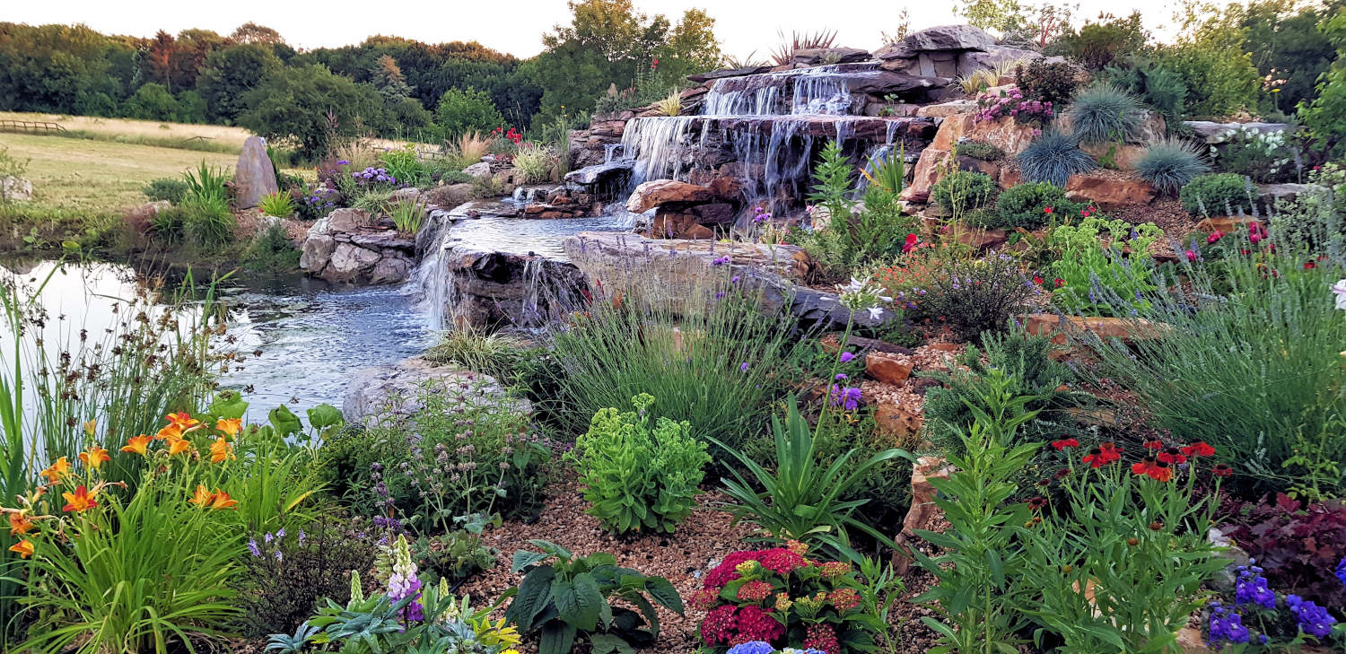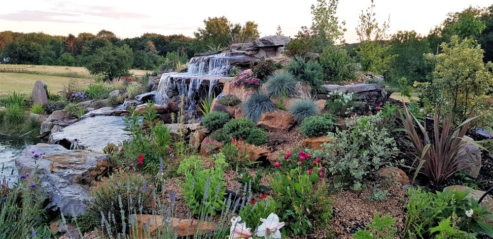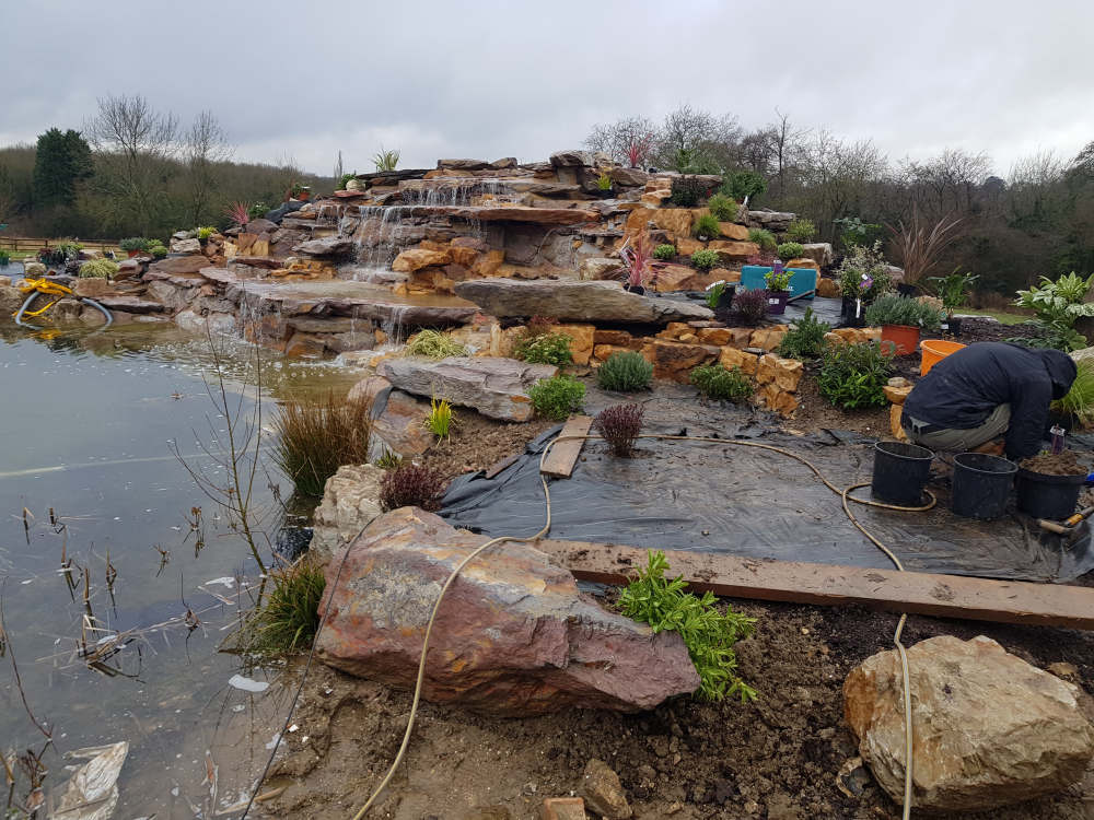 The sides of the lake a divided into four different sections. The front is grass turfs to be kept neat in front of the panoramic windows. The back contains the waterfall and all year round colour and foilage raised rockery beds plus a planted back edge with a quartz stone finish with a grass path walkway surrounded by a wildflower meadow. The sides are left for native species of aquatic and native plants with a grassland meadow for the young amphibians to hunt and hide from predators. The pumps that run the waterfalls are ultra lower power consumption eco pumps that are set to timers to prevent excessive algae build-up and keep energy use low. The natural planting keeps the water clean and clear without filters or treatments.