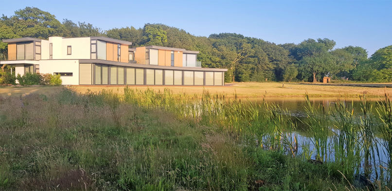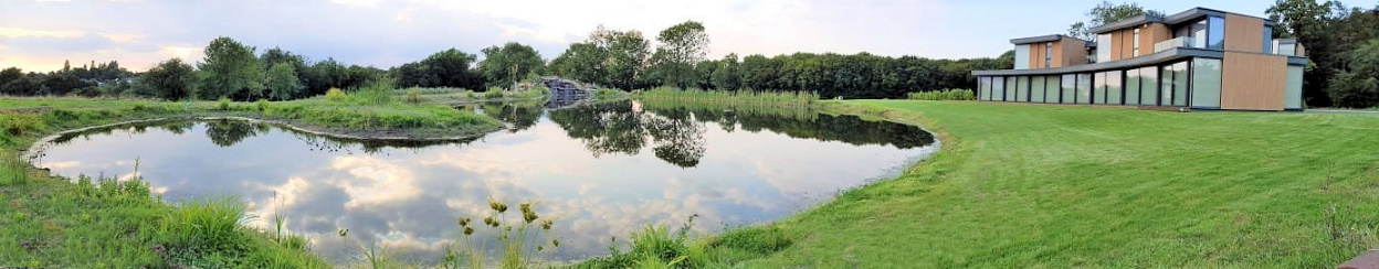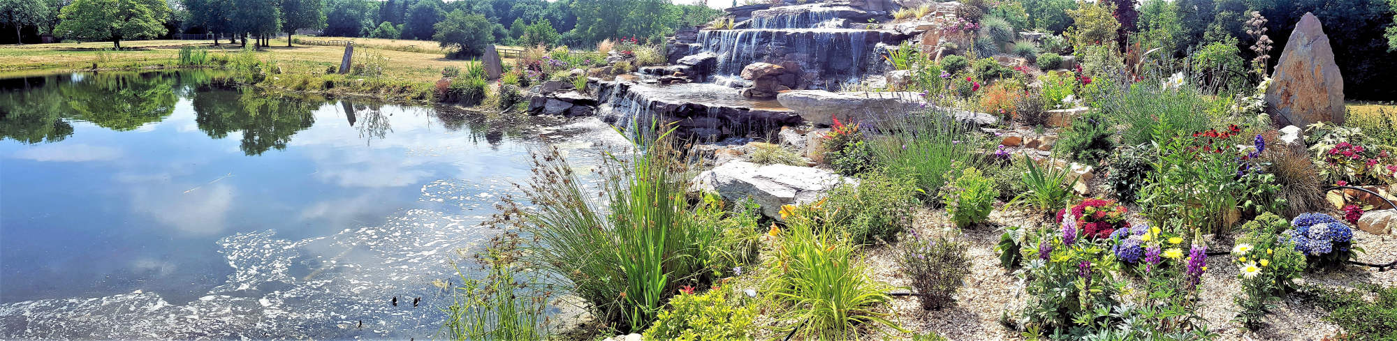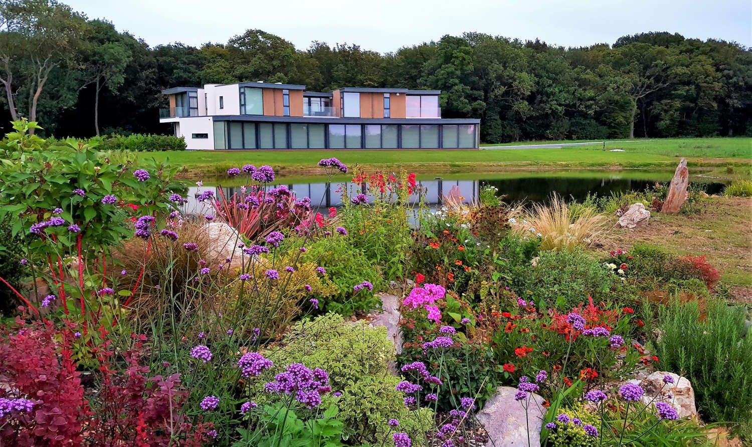 The sides of the lake a divided into four different sections. The front is grass turfs to be kept neat in front of the panoramic windows. The back contains the waterfall and all year round colour and foilage raised rockery beds plus a planted back edge with a quartz stone finish with a grass path walkway surrounded by a wildflower meadow. The sides are left for native species of aquatic and native plants with a grassland meadow for the young amphibians to hunt and hide from predators. The pumps that run the waterfalls are ultra lower power consumption eco pumps that are set to timers to prevent excessive algae build-up and keep energy use low. The natural planting keeps the water clean and clear without filters or treatments.