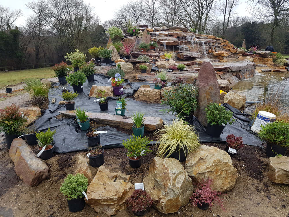 After the initial dig out by the building company, we moved in to create a lake with an extra-large waterfall. We were asked to create colourful rockery borders and give it a natural eco edge of native marginal plant species to encourage wildlife and create a natural balance without filtration systems. We used a mixture of purple shist and golden quartz rocks which both contain beautiful natural seams of colour to enhance the planting scheme. We fully maintain the lake, water feature and surrounding gardens for the client.
