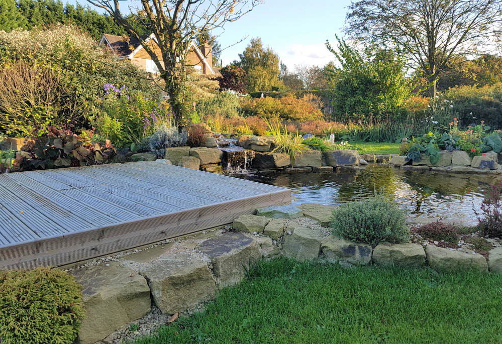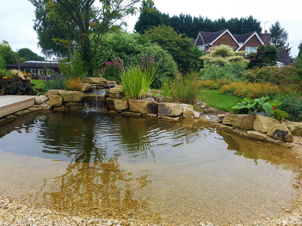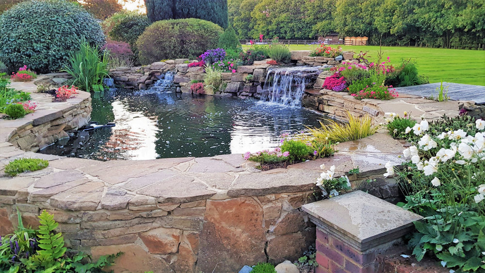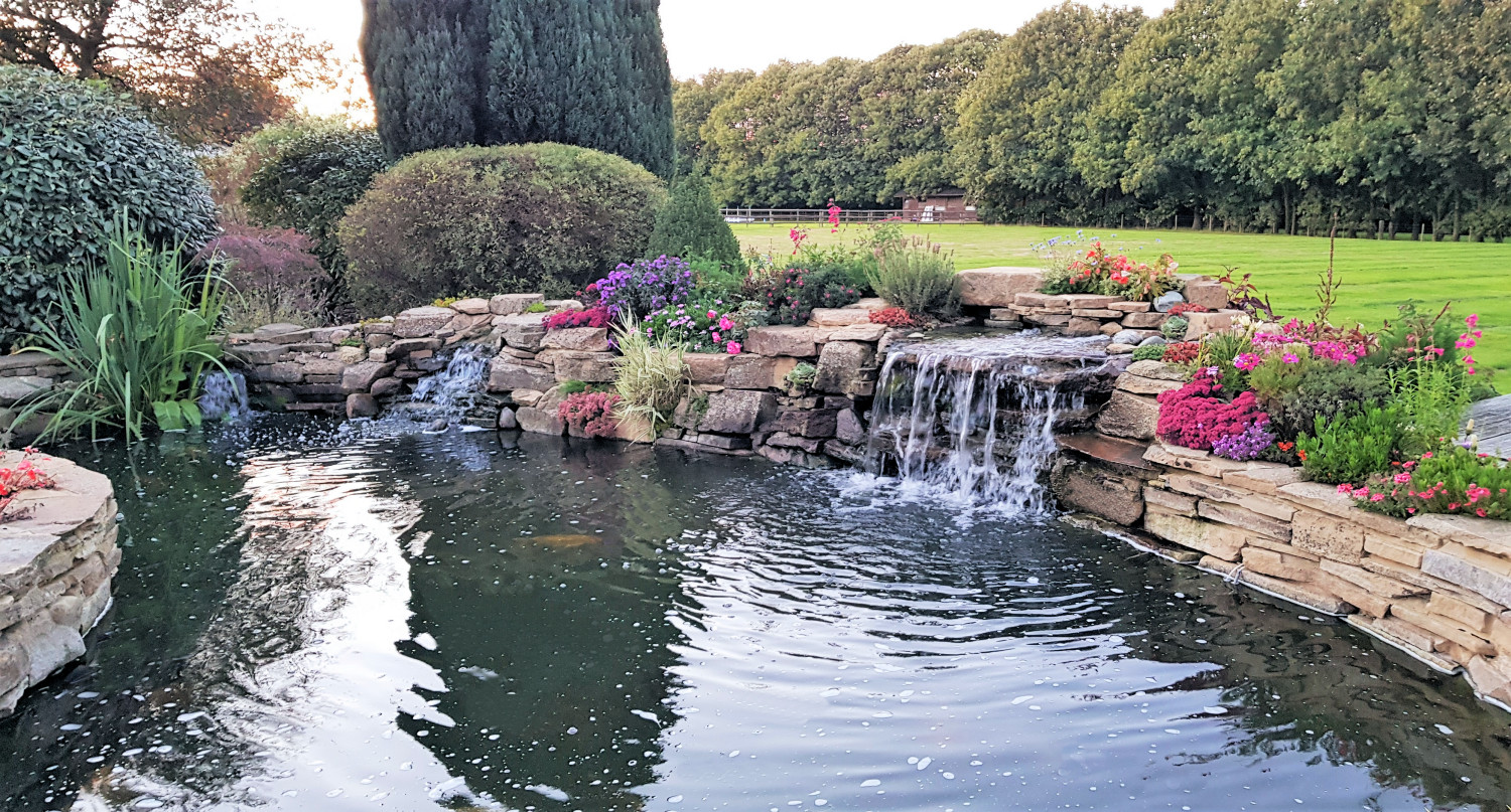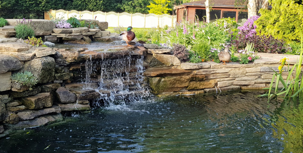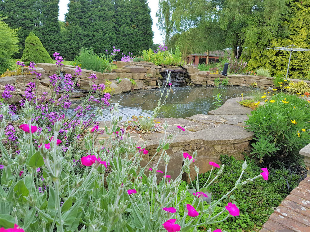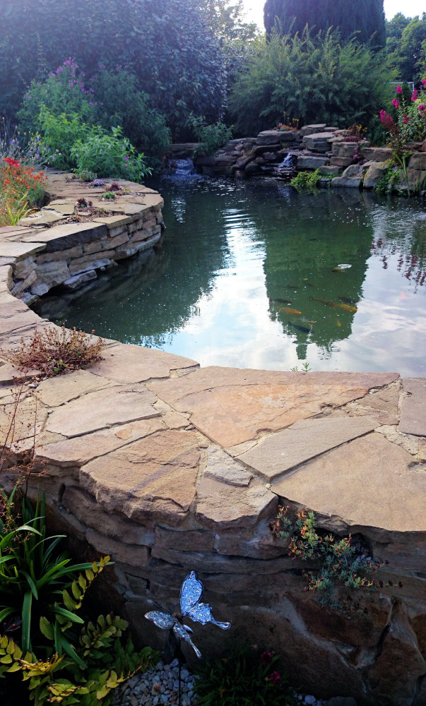 The premium rubber liner pond has steep sides surrounded with reclaimed natural stone to make it difficult for any predators, so no need for obstrusive nets. The stream was installed with a triple layer of membrane and liner with a covering or shingle bedded into concrete to give full protection and durability.We installed a reisn bound pathway with sleepers alongside the stream so to enjoy the sights and sounds of the natural looking stream as you walk up to the Breeze house area where there is another waterfall and pool for willdlife with aquatic plants.