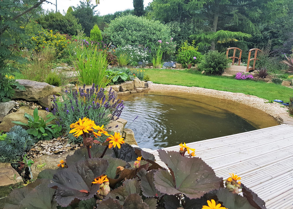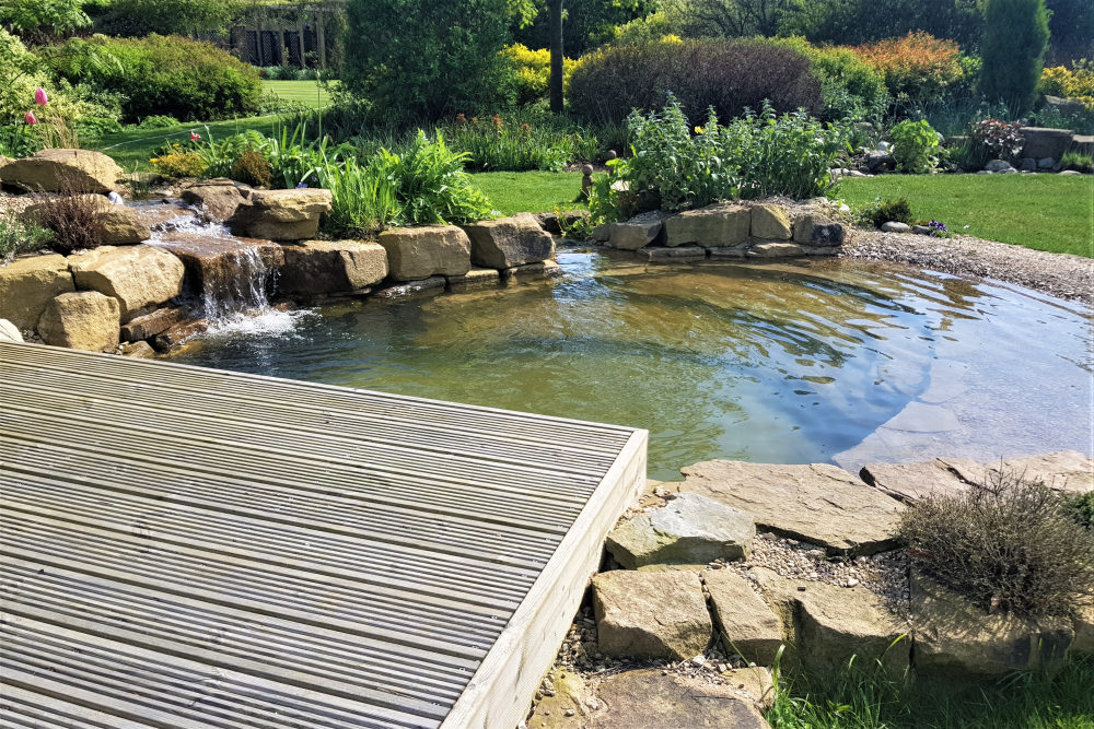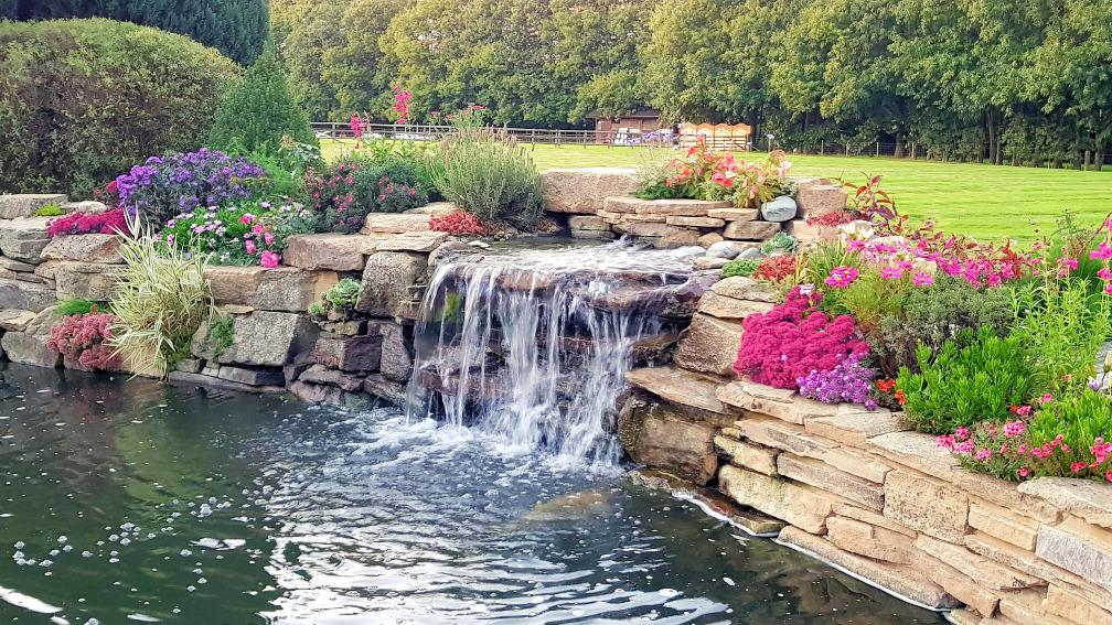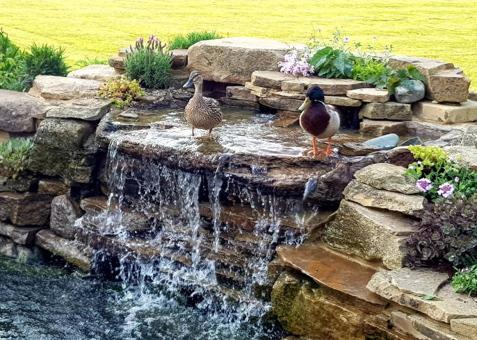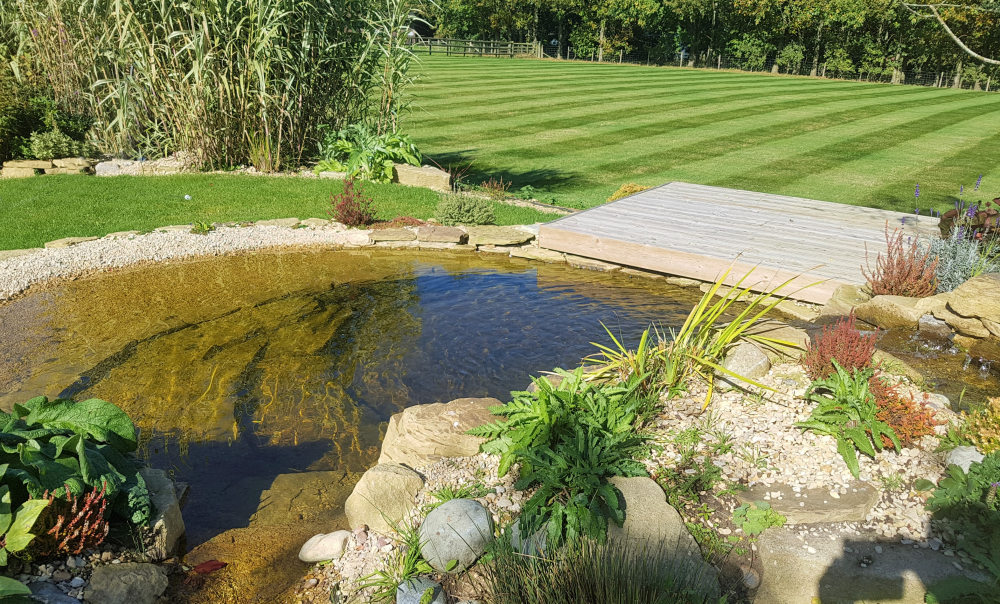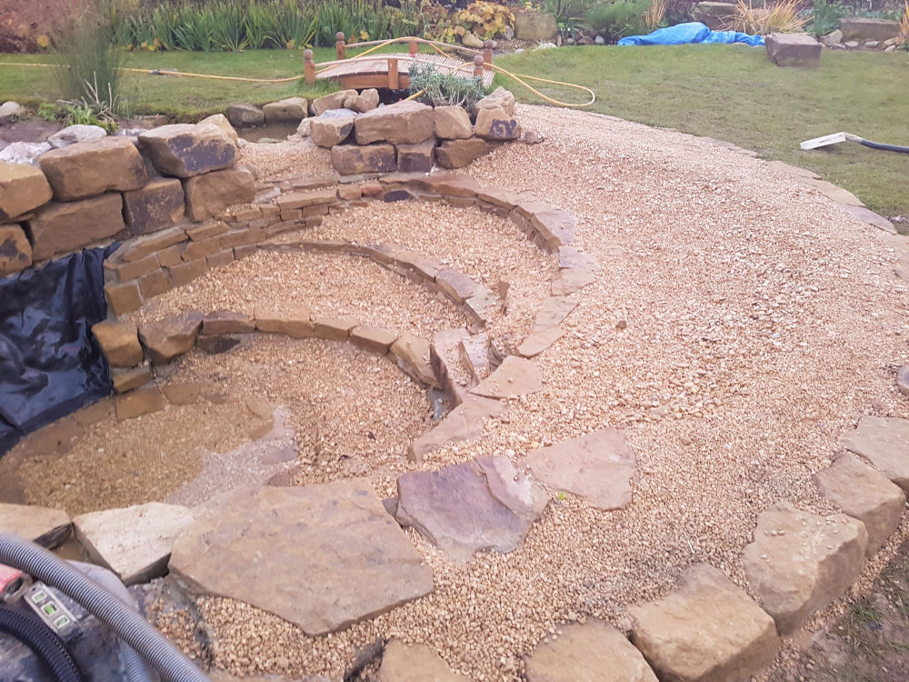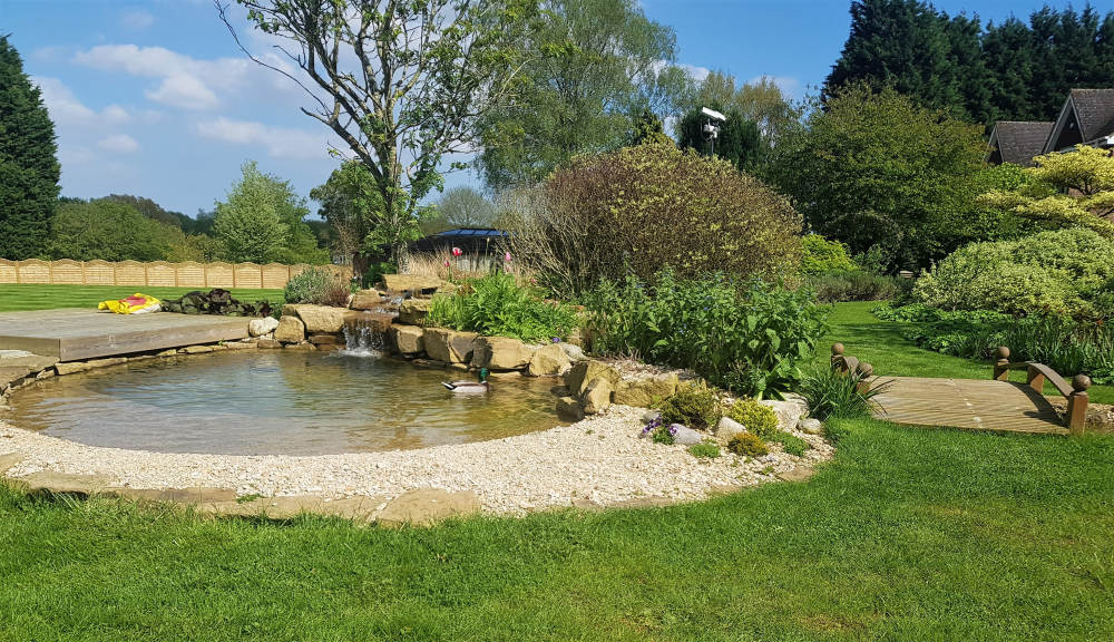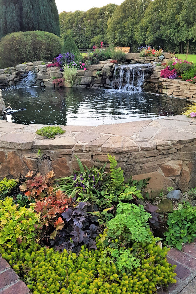 The premium rubber liner pond has steep sides surrounded with reclaimed natural stone to make it difficult for any predators, so no need for obstrusive nets. The stream was installed with a triple layer of membrane and liner with a covering or shingle bedded into concrete to give full protection and durability.We installed a reisn bound pathway with sleepers alongside the stream so to enjoy the sights and sounds of the natural looking stream as you walk up to the Breeze house area where there is another waterfall and pool for willdlife with aquatic plants.