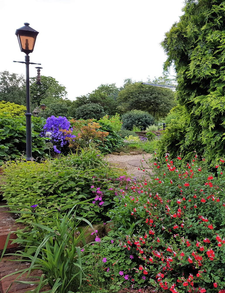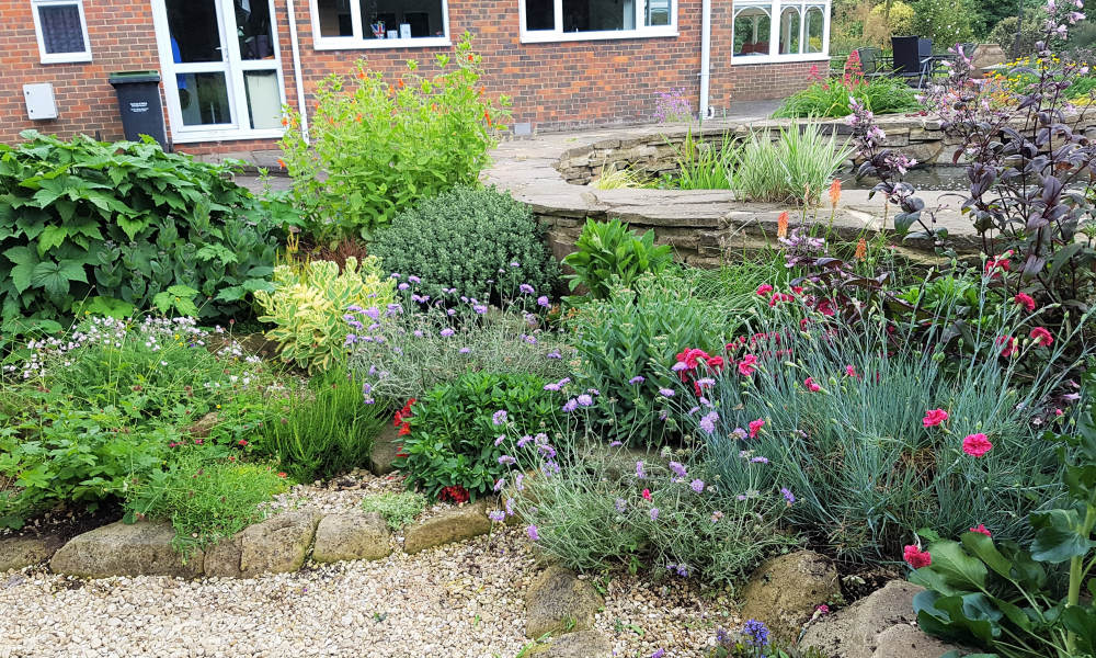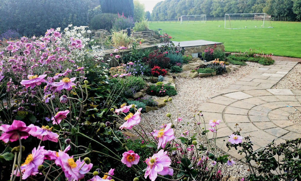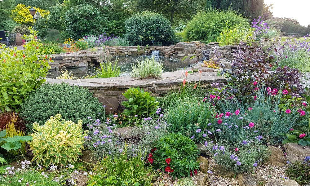 The stream and resin bound pathway with oak sleepers are surrounded by natural stone rockeries planted with vibrant colours which leads to timber bridges where you can cross the stream to circular terraced level lawn areas to sit and relax surrounded by the sounds of splashing water, lush foilage and all year round flowers bursting into life.