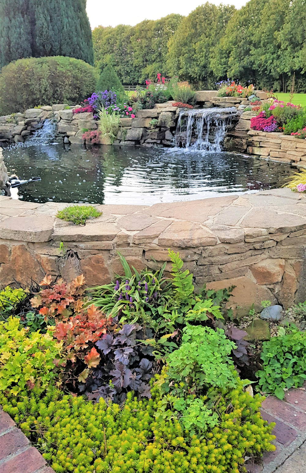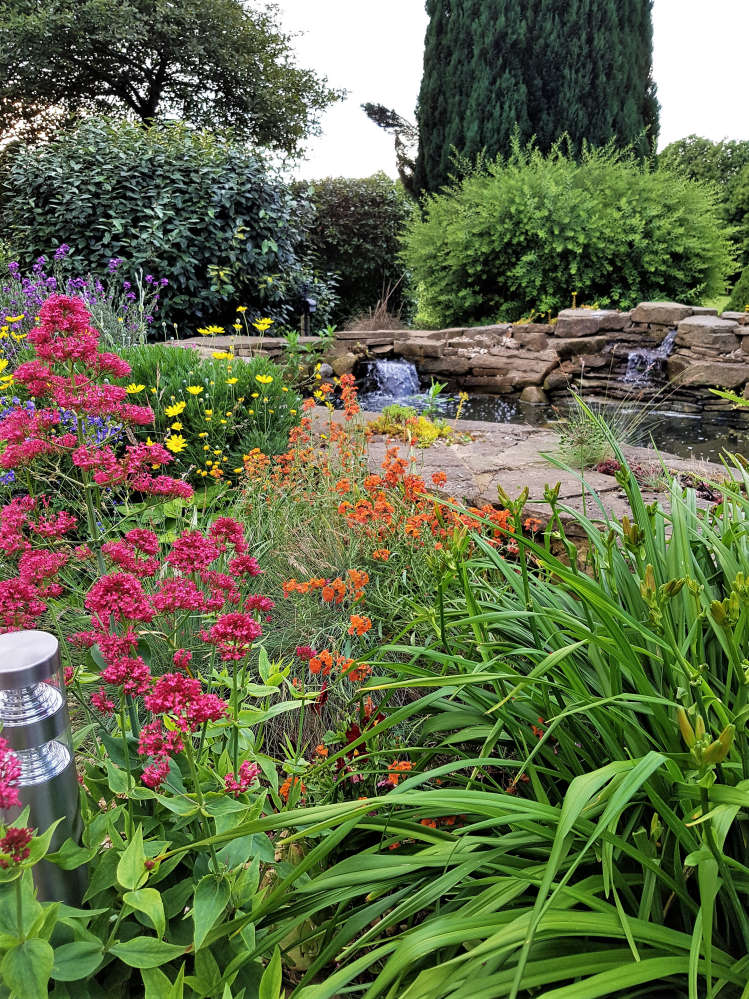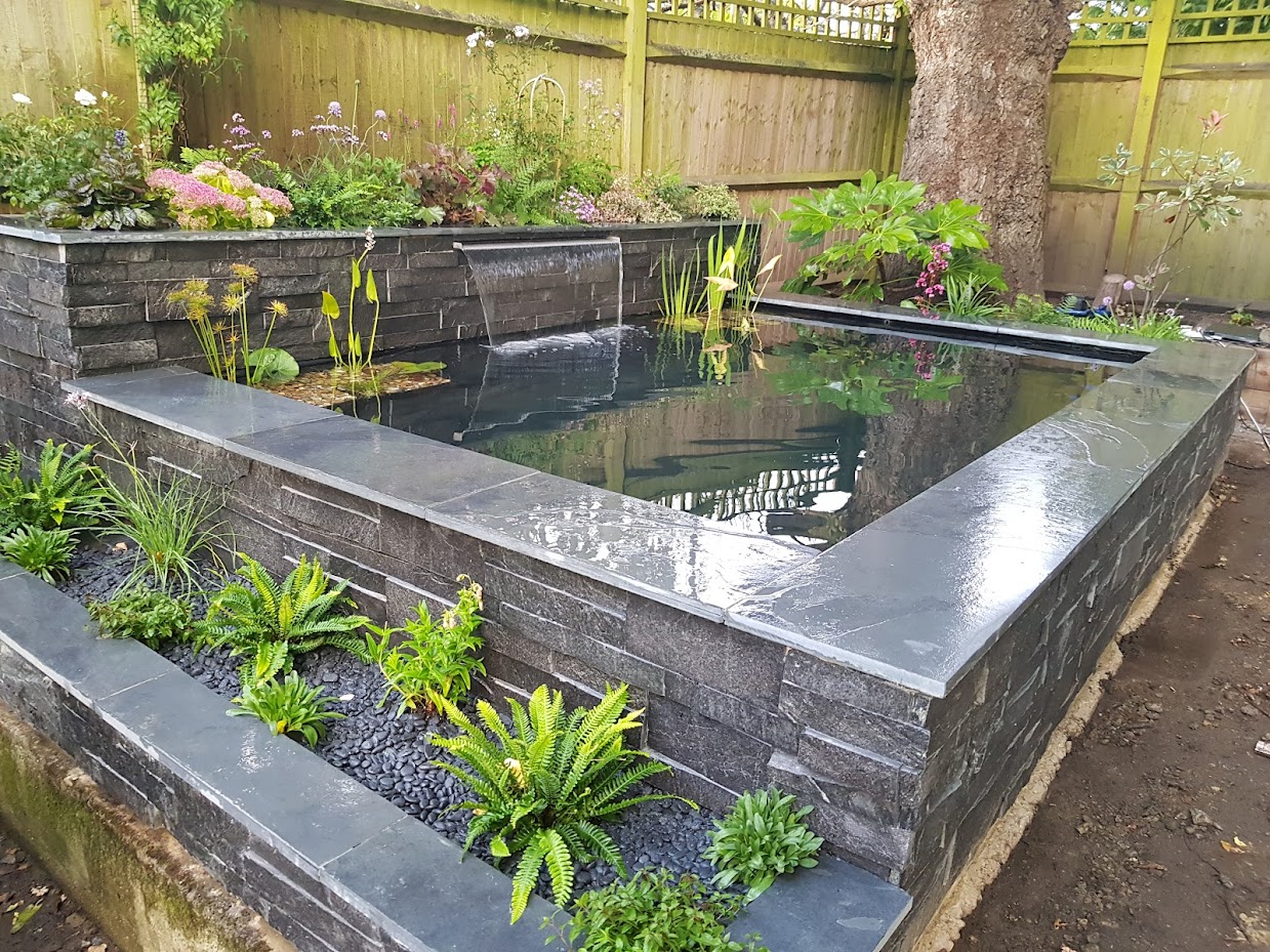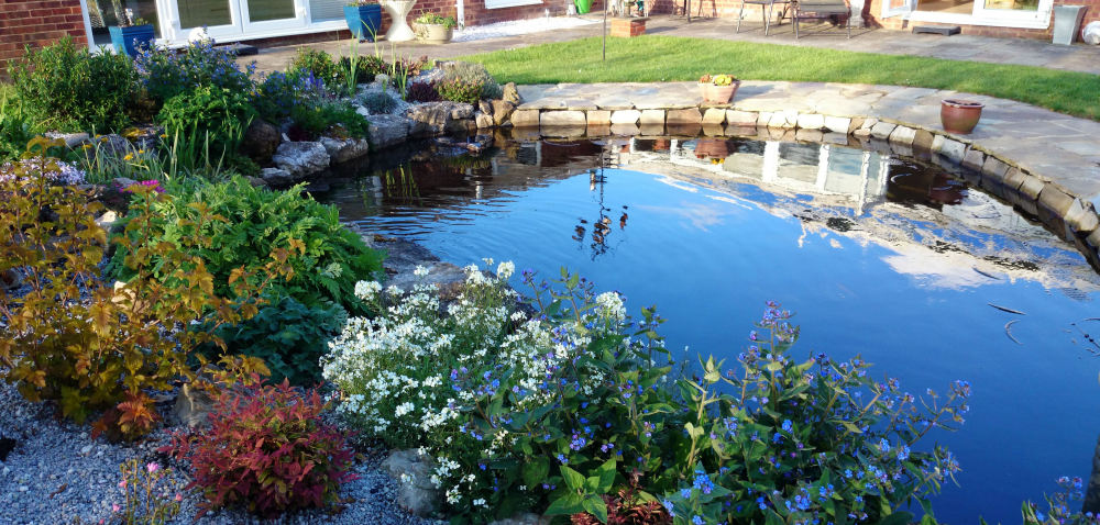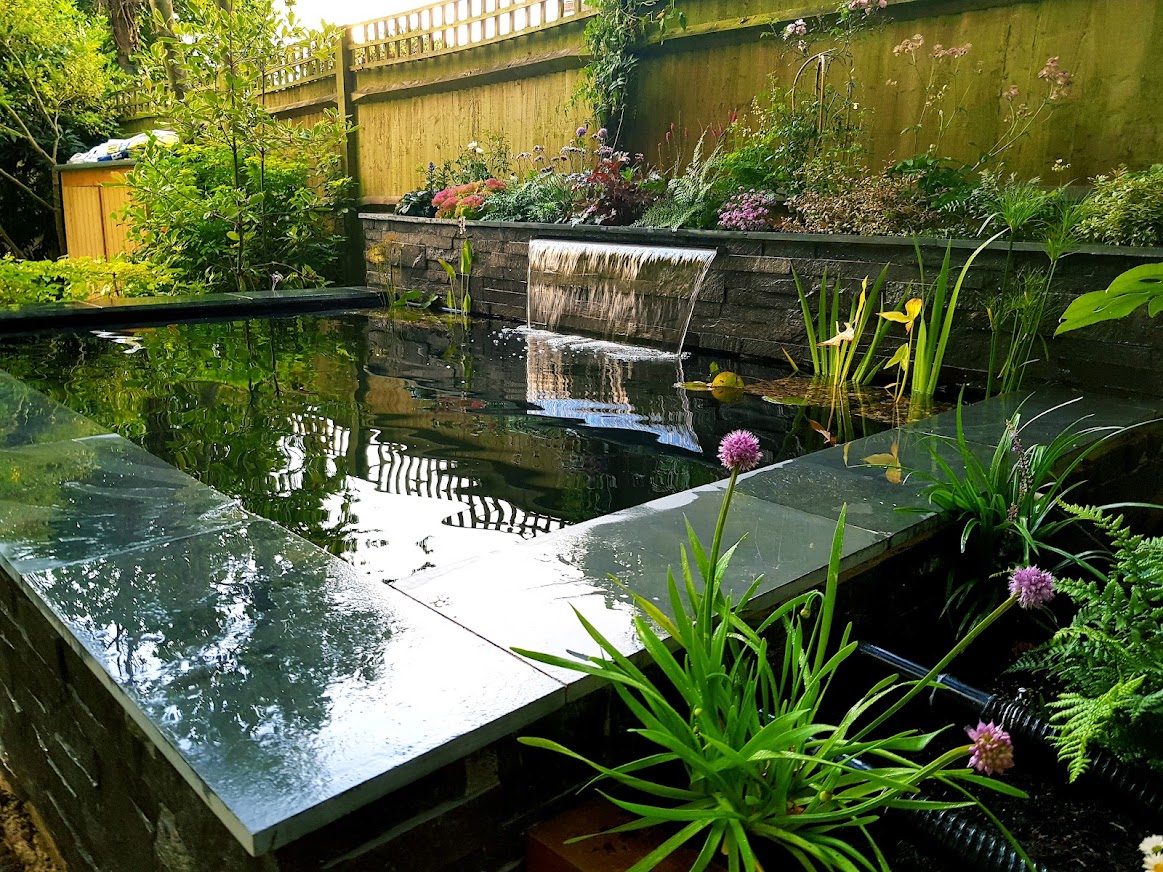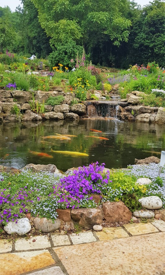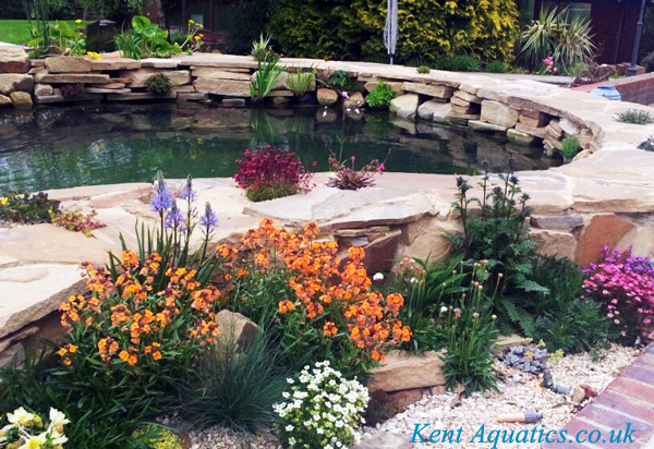 By combing natural stone and planting a Koi pond design does not need to be a simple raised rectangular pond devoid of natural beauty. The principles are the same of good filtration, preferably bottom drains and lots of open space but by including natural filtration techniques and by creating refugiums for pond life you can create Koi ponds that have their ecology which can improve the water quality, Koi health and also look great. We create "Bio-edge" living borders to the pond so the plants are safe from hungry Koi. The rocky edges can lead to bog gardens, reed beds, streams and waterfalls. The plants and wildlife will thrive away from hungry mouths but will also feed the koi when they enter the pond. Examples below and in Portfolio.